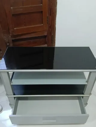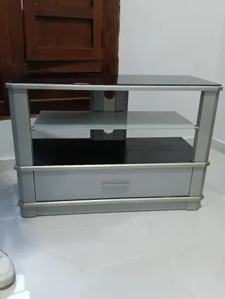 Mesa de televisión con un diseño moderno y funcional. - Estructura principal en color gris. - Superficie superior de cristal negro. - Estante intermedio de cristal. - Cajón inferior con tirador. - Patas y detalles en metal plateado.