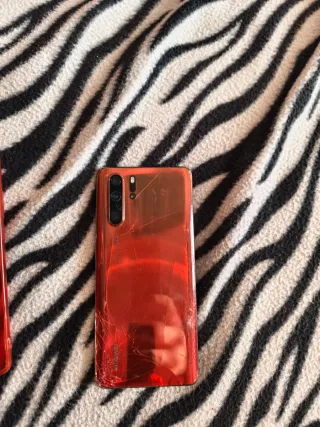 Teléfono móvil Huawei P30 Pro en color rojo. La batería tiene buena duración. - Pantalla con algunas grietas. - Parte trasera con grietas visibles.