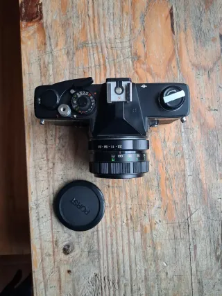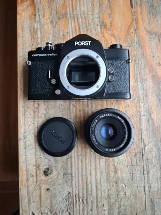 Camara Porst compact-reflex con Objetivo Porst Color Reflex Auto 55mm 2.8, en perfecto estado. La cámara funciona perfectamente en todas sus velocidades y el objetivo tiene las lentes limpias y sin hongos. Con enfoque suave y diafragma suave. Funciona con dos pilas lr44. - Montura: Porst. Rosca M42 - Distancia focal: 55mm. - Apertura máxima: f/2.8. - Diámetro de filtro: 49mm.