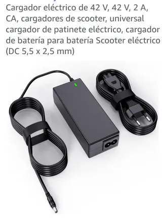 Cargador eléctrico para patinetes y scooters. - Voltaje: 42 V - Corriente: 2 A - Conector: DC 5,5 x 2,5 mm - Tipo de enchufe: CA