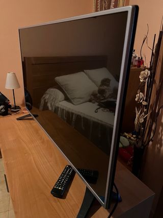Televisión LG de 43 pulgadas con un diseño elegante en plata y negro. - Pantalla de 43 pulgadas. - Marco plateado con base negra. - Uso normal, bien cuidada. - Incluye mando original - Peana original incluida