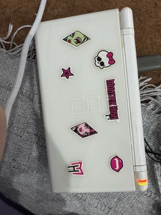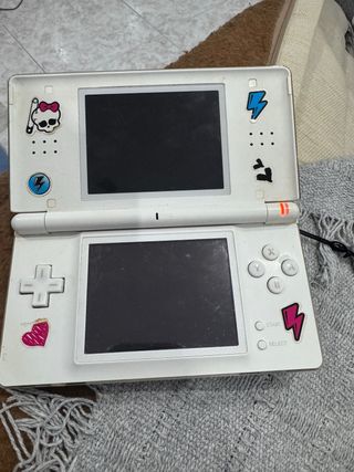 Consola Nintendo DS en color blanco, con cargador original y en muy buen estado, la consola tiene varias pegatinas de las monsters high (se pueden quitar), vendo también la funda de monsters high, 10 cartuchos para guardar juegos, 2 juegos originales el de shrek y el brain training y una tarjeta que tiene dentro 38 juegos como mario, harry potter, imagina ser cocinera, etc, tiene palitos originales con bastante uso, pero echo también unos bastantes nuevos, lo vendo todo
