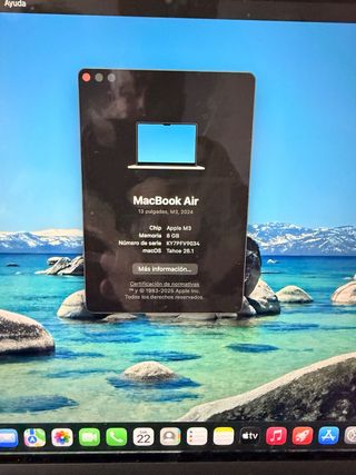 Prácticamente nuevo no se ha usado MacBook Air de 13 pulgadas con chip M3, lanzado en 2024. Cuenta con 8 GB de memoria RAM y 256 GB de almacenamiento. Tiene una pequeña abolladura , nada importante, en persona es menos. Completo con caja y cargador NO NEGOCIABLE ENVIO PRECIO PAGO GRACIAS - Chip: Apple M3 - Memoria: 8 GB - Almacenamiento: 256 GB - Pantalla: 13 pulgadas - Año: 2024 - Sistema Operativo: macOS Tahoe 26.1