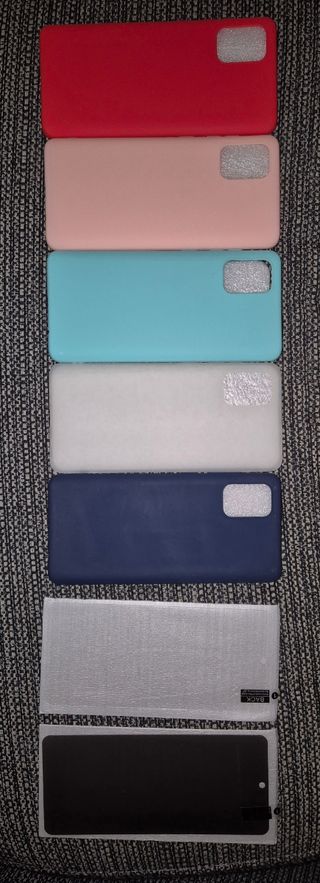 Lote de fundas y cristales templados para Samsung Galaxy A71. Incluye varias fundas de diferentes colores y protectores de pantalla. - 5 Fundas de silicona en colores rojo, rosa, blanco, azul claro y azul marino. - 2 Cristales templados para la pantalla: unos normal y otro antiespía.