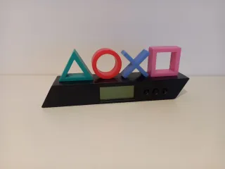 Este reloj de escritorio tiene un diseño inspirado en los icónicos botones de PlayStation. - Base negra con forma angular. - Pantalla digital verde. - Adornos de los símbolos: triángulo verde, círculo rojo, cruz azul y cuadrado rosa.