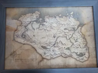 Mapa decorativo de la Provincia de Skyrim, ideal para los fans del videojuego. - Diseño estilo pergamino antiguo. - Marco de madera gris.
