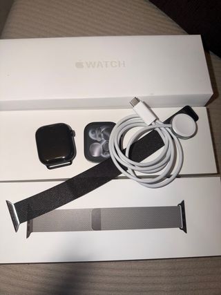 Reloj Apple Watch Series 11 con GPS. Incluye cargador y correa. - Caja de aluminio negro. - Correa de malla milanesa plateada. - Cable de carga USB-C. Tiene tres meses de uso, esta en perfecto estado y se vende por no hacerlo servir.