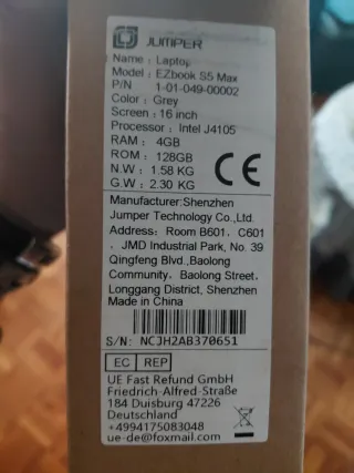 Portátil Jumper EZbook S5 Max con muy poco uso, prácticamente nuevo. Incluye funda. - Pantalla de 16 pulgadas. - Procesador Intel J4105. - 4GB de RAM. - 128GB de almacenamiento ROM. - Peso neto: 1.58 KG. - Peso bruto: 2.30 KG. - Fabricado en China.