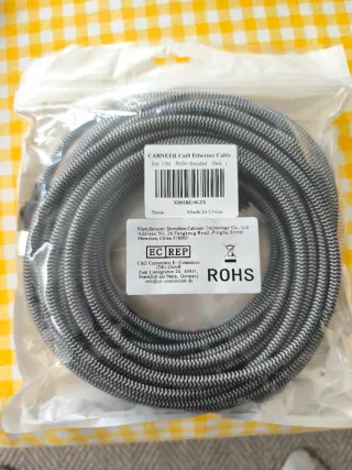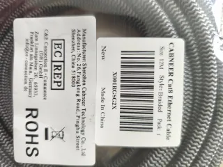 Cable de red Ethernet Cat8 de 12 metros de longitud, con un diseño trenzado y duradero. Este cable es ideal para conexiones de alta velocidad. - Color: Negro y gris - Longitud: 12 metros - Estilo: Trenzado - Tipo: Cable Ethernet Cat8 - Fabricante: CABNEER
