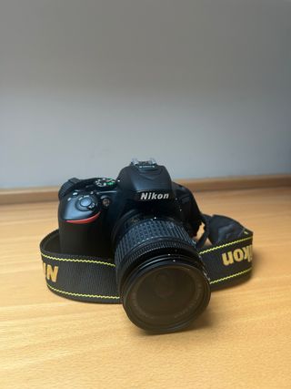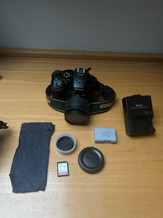 Cámara réflex digital Nikon D5500 en color negro. - Sensor de imagen DX. - Pantalla táctil abatible. - Conectividad Wi-Fi y NFC incorporada. En perfecto estado, apenas uso. Comprada más o menos en 2015-16. Viene con un objetivo Nikon 18-56mm. También con mochila protectora, tarjeta de memoria, fundas de protección.