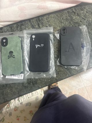Lote de tres fundas para iPhone XR. - Funda verde con diseño de calavera. - Funda negra con texto you ♡. - Funda negra con inicial A grabada.