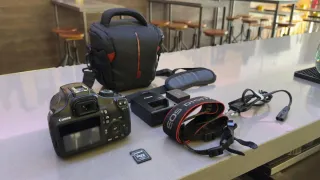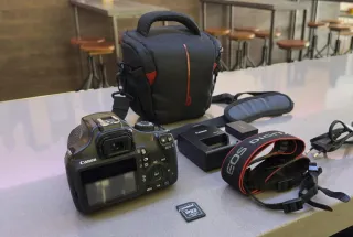 Cámara réflex digital Canon EOS 1100D en color negro. Incluye accesorios para empezar a fotografiar. - Cámara réflex digital Canon EOS 1100D. - Bolso de transporte. - Cargador de batería. - Correa para el cuello. - Tarjeta de memoria. Objetivo, canon, Sony, olympus, Panasonic, Kodak, fotografía, Fujifilm