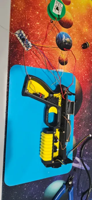 Conjunto de componentes para ensamblar una lightgun. - Placa de circuito con cables. - Componentes electrónicos varios. - Carcasa impresa en 3D (negro y amarillo).