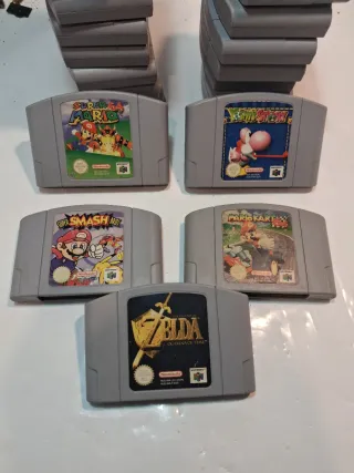 CA 0593. Lote de 5 videojuegos para Nintendo 64. Precio de lote: 190 euros. The Legend of Zelda: Ocarina of Time: 50e. Super Mario 64: 35e. Mario Kart 64: 40e. Super Smash Bros 40e. Yoshi's Story 30e. Tengo 19 juegos más. Tags: nintendo game gamming retro vintage colección coleccionismo consola. P: 0,6Kg