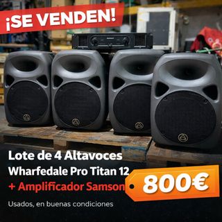 Se vende lote de 4 altavoces Wharfedale Pro Titan 12 junto con un amplificador Samson. - Altavoces en color gris oscuro - Amplificador en color negro. - Usados, en buenas condiciones.