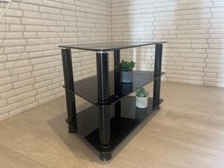 Elegante mesa de TV con superficie de cristal templado negro y estructura de metal. - Diseño moderno de tres niveles. - Patas metálicas negras. - Superficie de cristal templado negro. Medidas: 50 cm (alto) x 75 cm (ancho) x 40 cm (fondo)
