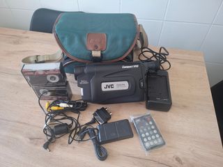Cámara de video JVC GR-AX77 en buen estado. Incluye 3 cintas VHS-C. - Modelo Compact VHS. - Zoom digital de 50x. - Incluye cargador, mando a distancia y cables. - Se entrega con su estuche original.