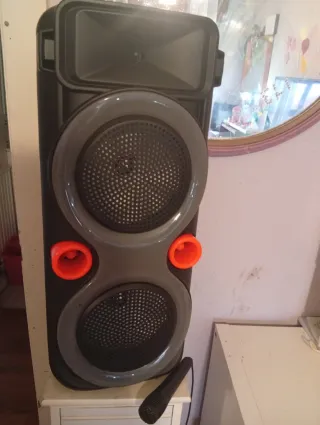 Altavoz portátil con diseño moderno y dos asas laterales naranjas. - Dos altavoces principales. - Asa superior para transporte. - Incluye micrófono.