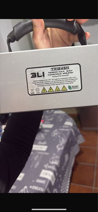 Batería recargable de Ion Litio. - Modelo: TR1245N - Tensión Máx: 12.6V - Capacidad: 499.5WH - No cargar con temperatura mayor a 45°C. - No exponer a la radiación solar. - No sumergir en ningún fluido, especialmente en agua salada.