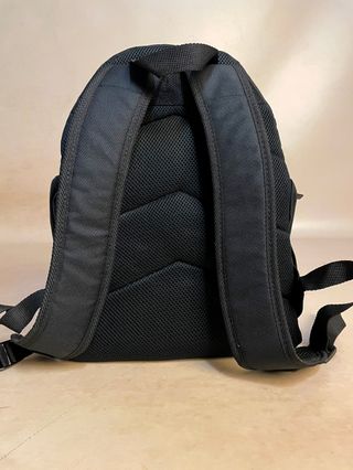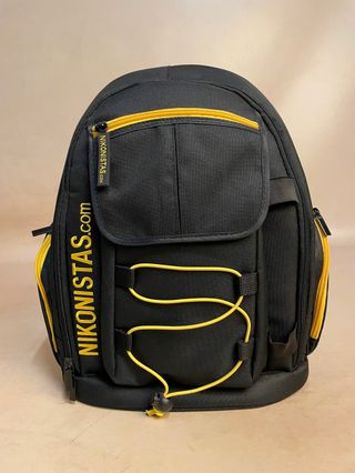 Mochila negra con detalles en amarillo, ideal para cámaras o accesorios. - Compartimento principal con cierre. - Bolsillo frontal con cierre. - Cuerdas elásticas decorativas y funcionales. - Logo de Nikonistas.com bordado.