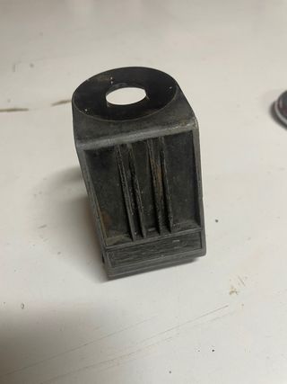 Soporte para antena de radioaficionado. Pieza metálica con diseño robusto. - Material: Metal - Color: Negro - Diseño: Rectangular con ranuras verticales y base texturizada.