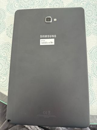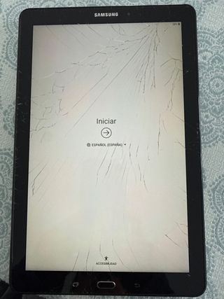 Tablet Samsung en color negro. - Pantalla con grietas visibles. - Botones de navegación inferiores. Regalo funda