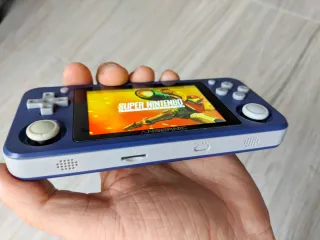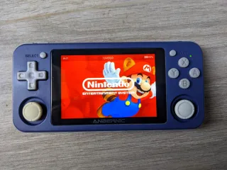 Consola portátil Anbernic RG351P en color morado. Incluye tarjeta de 64gb y adaptador wifi. Con la versión más reciente de AmberElec instalada. Pantalla IPS de 3,5 pulgadas, laminación completa OCA/ 320*480