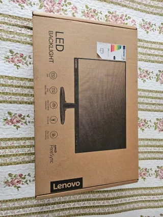 Monitor Lenovo 23.8 pulgadas. - Resolución Full HD (1920 x 1080). - Conexiones VGA y HDMI. - Tecnología Eye-Care. - Compatible con AMD FreeSync. Lo compré hace 2 años, esta como nuevo. Tiene sus plasticos originales, la mancha verde de la funda protectora es pintura que se me derramó pero el monitor esta perfecto.
