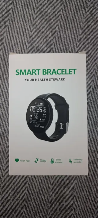 Pulsera inteligente con funciones de seguimiento de salud. - Monitorización de ritmo cardíaco. - Contador de pasos. - Medición de presión arterial. - Recordatorio de sedentarismo.