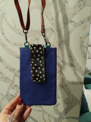 Funda para móvil de piel con un diseño original. - Color azul vibrante. - Detalle de pelo con lunares. - Correa de cuero marrón. - Cierre con clip.