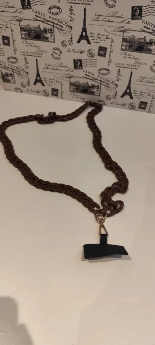 Cordón de cadena marrón para móvil con un colgante negro en forma de T. El cordón tiene un cierre de mosquetón dorado. - Cadena de eslabones gruesos. - Colgante de tela negra. - Cierre metálico dorado.