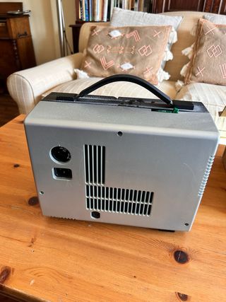 Proyector de cine antiguo guardado en su maletín original. Ideal para coleccionistas o amantes de lo retro. - Diseño compacto en maletín. - Mecanismo de proyección visible. - Asa de transporte superior.