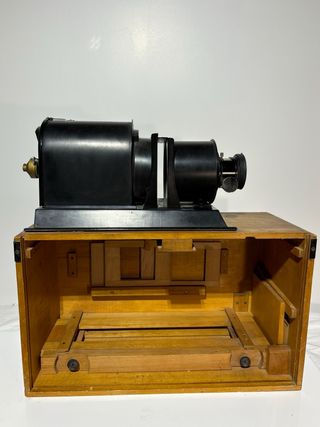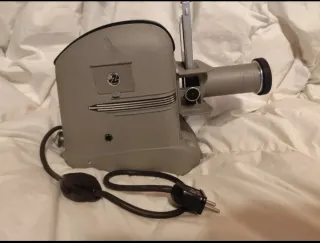 Proyector antiguo de diapositivas o películas caseras, probablemente de mediados del siglo XX. La marca Rau, era conocida por fabricar equipos de este tipo, especialmente en Europa. Estos proyectores eran usados para visualizar imágenes en diapositivas o pequeños rollos de película. El diseño sugiere que podría haber sido pensado para uso doméstico o escolar.