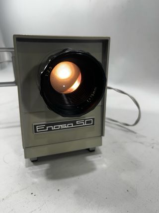 Proyector de diapositivas Enosa 50 en buen estado. Es un proyector antiguo, de color beige y gris, que está en buenas condiciones estéticas y funcionales
