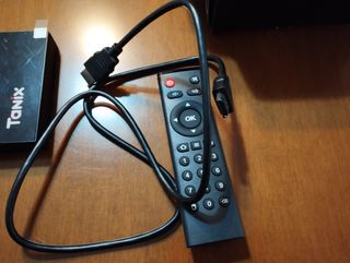 TDT tanix con cable USB cargador mando e instrucciones para poder instalar aplicaciones y canales de televisión.
