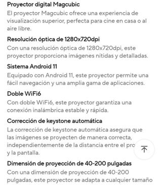 Proyector digital Magcubic con resolución óptica de 1280x720dpi. Ofrece una experiencia de visualización superior. - Sistema Android 11 para fácil navegación y acceso a aplicaciones. - Doble WiFi6 para conexión inalámbrica estable y rápida. - Corrección de keystone automática para imágenes proyectadas correctamente. - Dimensión de proyección de 40-200 pulgadas.
