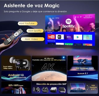 Proyector con resolución 4K UHD y sistema Android. - Conectividad WiFi 6.0. - Soporte para Auto Keystone. - Compatible con Netflix, Prime Video y YouTube. - Incluye control remoto.