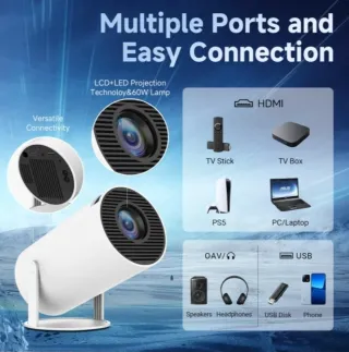 Proyector de alta calidad con capacidad 4K. Diseño moderno y compacto. Control con ratón, WiFi 6 BT5.2 Auto krystone 180 grados de rotación, compatible con HDMI/TV/stick/USB/laptop e incorpora aplicaciones como Netflix, HBO, youtube... sin necesidad de conectar ningun dispositivo externo, simplemente metes la cuenta y ya puedes disfrutar de todas las aplicaciones.