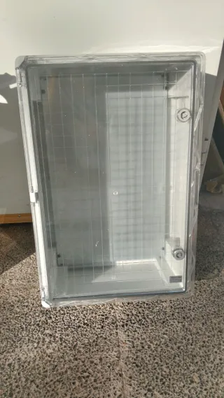 Caja de distribución eléctrica con tapa transparente. Ideal para proteger equipos eléctricos. - Material: Plástico resistente. - Diseño: Tapa transparente con rejilla interior. - Cierre: Dos puntos de anclaje con tornillo.