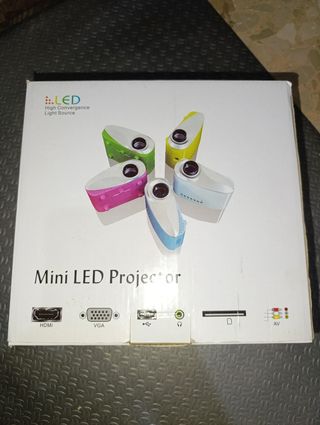 Proyector LED Mini de Excelvan, en color blanco y plata. Está en perfecto estado. - Dispone de puertos HDMI, VGA, USB y AV. - Fuente de luz LED de alta convergencia.