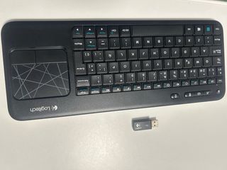 Teclado inalámbrico Logitech con touchpad integrado, ideal para tu televisor o centro multimedia. Incluye su receptor USB para una fácil conexión. - Diseño compacto y funcional. - Touchpad para control del cursor. - Receptor USB incluido.