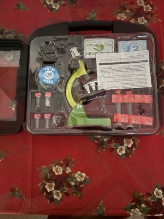 Microscopio para niños en buen estado, listo para usar. Incluye estuche de transporte. - Microscopio con accesorios: tubos de ensayo, colorante, lentes... - Ideal para principiantes. - Perfecto para aprender ciencia.