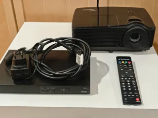 Proyector de la marca Optoma en color negro. Incluye su mando a distancia. - Mando a distancia incluido. - Diseño elegante en negro. -Precio proyector 150€ -Precio pantalla 100€ -Conjunto 230€