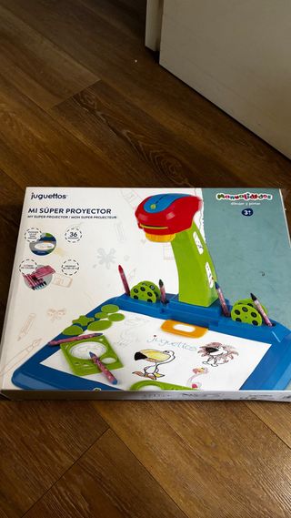 Divertido proyector de dibujo para que los más pequeños den rienda suelta a su creatividad. Incluye varios accesorios para pintar y dibujar. - 3 diapositivas de linterna. - 24 patrones. - 2 rotuladores de agua. Uno pinta poco (llevaba 6 originalmente). - Borrador. - Caja original en perfecto estado, con asa.