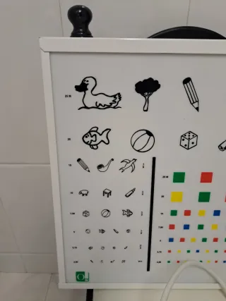 Optotipo infantil con divertidos dibujos para la revisión de la vista. Incluye un panel con figuras y un tablero de colores. Medidas... 44x38x11cm - Diseñado para niños. - Panel con figuras variadas. - Tablero de colores.