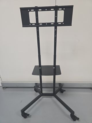 Soporte móvil para televisores, ideal para presentaciones o uso doméstico. - Estructura metálica negra. - Bandeja inferior. - Ruedas para fácil desplazamiento.