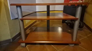 Mesa auxiliar de metal y cristal con ruedas, ideal para la televisión o como carrito de servicio. Se encuentra en buen estado. - Estructura de metal. - Bandejas de cristal. - Ruedas para fácil movilidad. - Tres niveles.