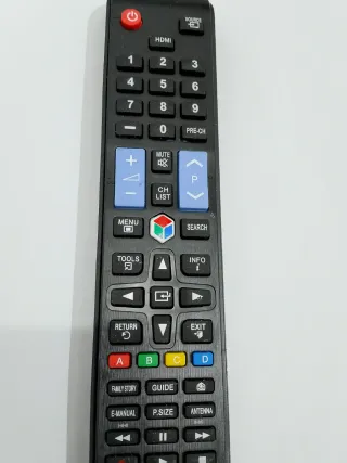 Mando a distancia para Smart TV Samsung. - Botones numéricos del 0 al 9. - Control de volumen y canales. - Botones de función: MUTE, PRE-CH, MENU, TOOLS, INFO, SEARCH, RETURN, EXIT. - Botones de colores A, B, C, D. - Botones de reproducción: Play, Pause, Stop, Avance Rápido, Retroceso Rápido. - Botones de navegación (arriba, abajo, izquierda, derecha, OK). - Botón de encendido/apagado.