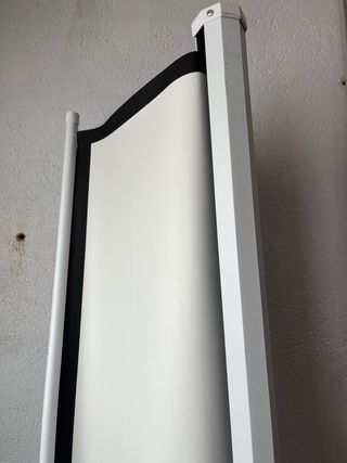 Pantalla de proyector auto-enrollable por sistema mecanico (no electrico). - Superficie de proyección blanca. - Borde negro. - Estructura de aluminio con soportes para colgar del techo o pared. Tiene un pequeño desgarro justo donde acaba el borde negro pero por lo demás impecable