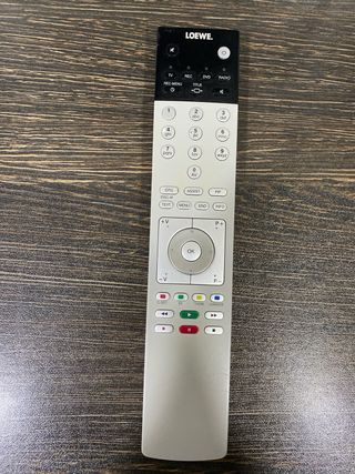 Mando a distancia original para televisores Loewe. Diseño plateado y negro. - Botones numéricos del 0 al 9. - Botones de función: TV, STB, VIDEO, AUDIO, ZOOM, EPG, HOME, PIP, TEXT, MENU, BACK, INFO. - Botones de navegación y OK. - Botones de reproducción: Play, Pausa, Stop, Avance rápido, Retroceso rápido, Grabación. - Botón de encendido/apagado.